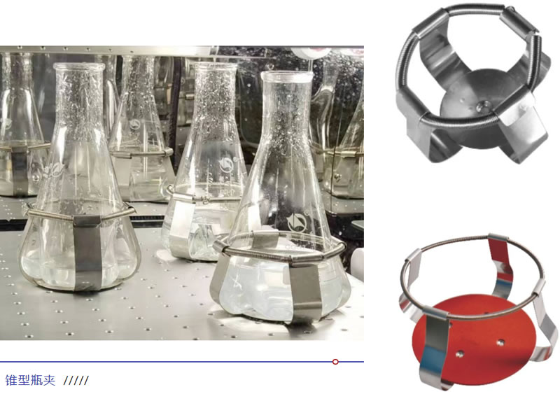 對以上有經(jīng)典錐度的錐形瓶,可以采用比較傳統(tǒng)的錐形瓶夾來固定在搖床的搖板上,一般采用不銹鋼彈簧片加彈簧來包裹住錐形瓶的錐形大端,以保證在一定偏心轉(zhuǎn)速下不被離心力甩出,而使培養(yǎng)液在搖瓶中和搖板同相旋轉(zhuǎn)。一般每種容量的錐型瓶有對應(yīng)規(guī)格的錐形瓶夾,提供25ml、50 ml、100 ml、150 ml、200 ml、250 ml、500 ml、1000 ml、2000 ml、3000 ml、5000 ml這些規(guī)格。