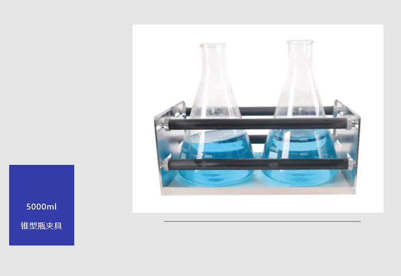 為了保證大容量搖瓶高速搖動時的安全性,還特意提供了夾棍式5000ml錐型瓶夾具。