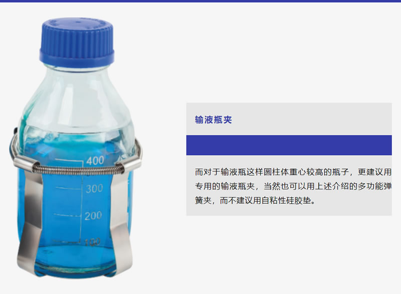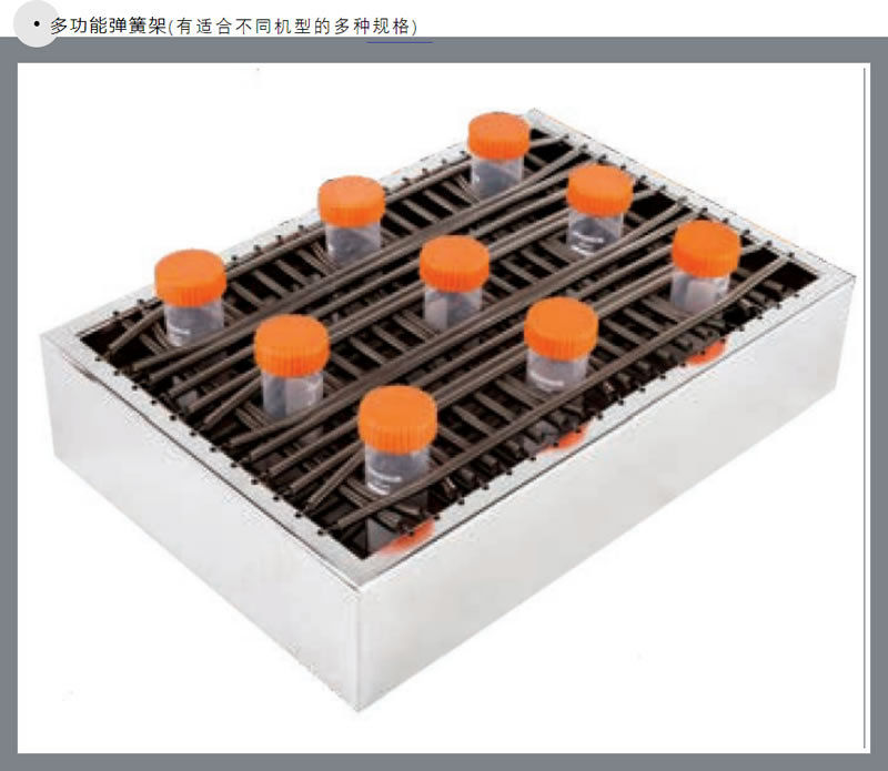 當(dāng)有些搖床需要多種容器混用或每次培養(yǎng)周期會使用不同容器時,推薦選用多功能彈簧架,可以兼容放置錐型瓶、輸液瓶、試管、離心管,甚至異形瓶等多種容器。