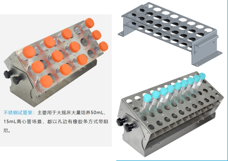 使用搖床培養(yǎng)時會用到錐型瓶、輸液瓶、試管、離心管、培養(yǎng)板等容器,來放置培養(yǎng)液進(jìn)行培養(yǎng)。為了將這些容器固定在搖床的搖板上,需要用到不同的附件來固定它們,另外,還有一些提高培養(yǎng)效率或使用方便性的附件,最近幾期我們將專門對此作介紹。(如果用戶有更多功能拓展的附件需求可以向我們反饋)