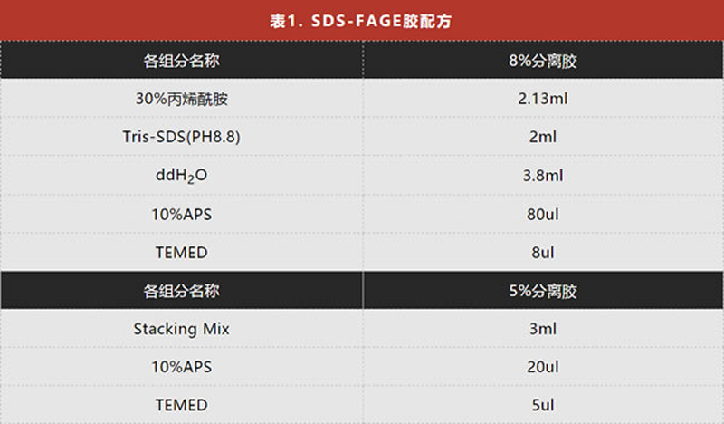 取下配好的膠置于電泳槽內(nèi),從槽中間加入電泳緩沖液,中間倒?jié)M沒(méi)過(guò)梳子,外面至相應(yīng)刻度線即可。平行拔出梳子,用200ul移液槍吹孔,以保證孔內(nèi)通暢。按照Marker 加2.5ul/孔,蛋白樣品加10ul/孔。