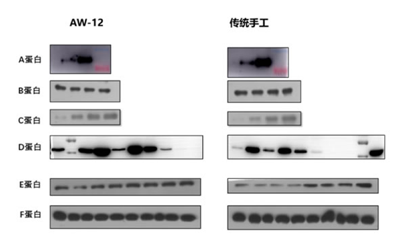 比較AW-12全自動(dòng)清洗工作站和傳統(tǒng)手工方法操作Western blot實(shí)驗(yàn)得出的顯影效果,驗(yàn)證儀器使用的可靠性及穩(wěn)定性。