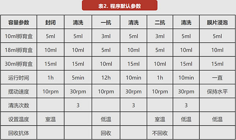 ②根據(jù)所選擇孵育盒的規(guī)格準(zhǔn)備抗體的量(參見(jiàn)表2),然后將一抗二抗抗體加入對(duì)應(yīng)抗體管中,并將抗體管放進(jìn)對(duì)應(yīng)的抗體儲(chǔ)存位置,孵育盒放進(jìn)孵育槽中,手動(dòng)向孵育盒中加入5%脫脂牛奶(加液量參見(jiàn)表2)。