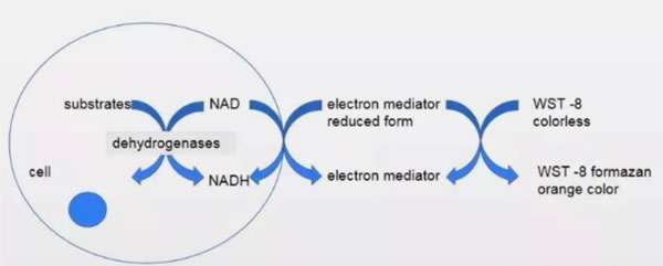 試劑中的WST-8 (2-(2-甲氧基-4-硝苯基)-3-(4-硝苯基)-5-(2,4-二磺基苯)-2H-四唑單鈉鹽),在電子載體存在的情況下,被細(xì)胞內(nèi)的脫氫酶還原為具有高度水溶性的橙黃色甲瓚產(chǎn)物,生成的甲瓚產(chǎn)物的量與活細(xì)胞的數(shù)量成正比。