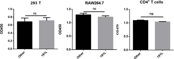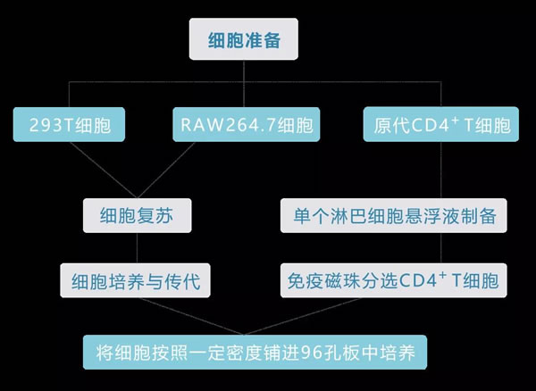 2 在96孔板每孔中鋪入細(xì)胞,293T細(xì)胞和RAW264.7細(xì)胞按照1×104/100uL/孔。CD4+ T細(xì)胞按照5×105/100uL/孔,注意:鋪CD4+ T細(xì)胞之前按照1ug/mL anti-CD3包板, 1ug/mL anti-CD28與細(xì)胞同時鋪板進(jìn)行活化。