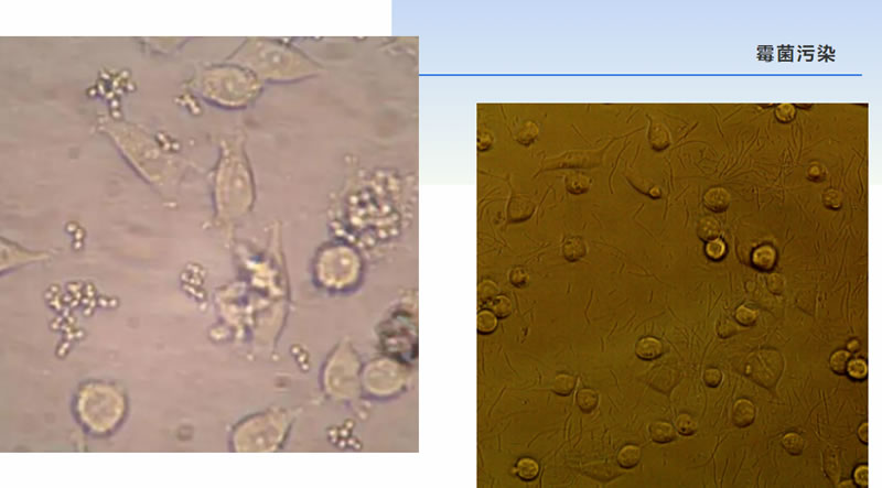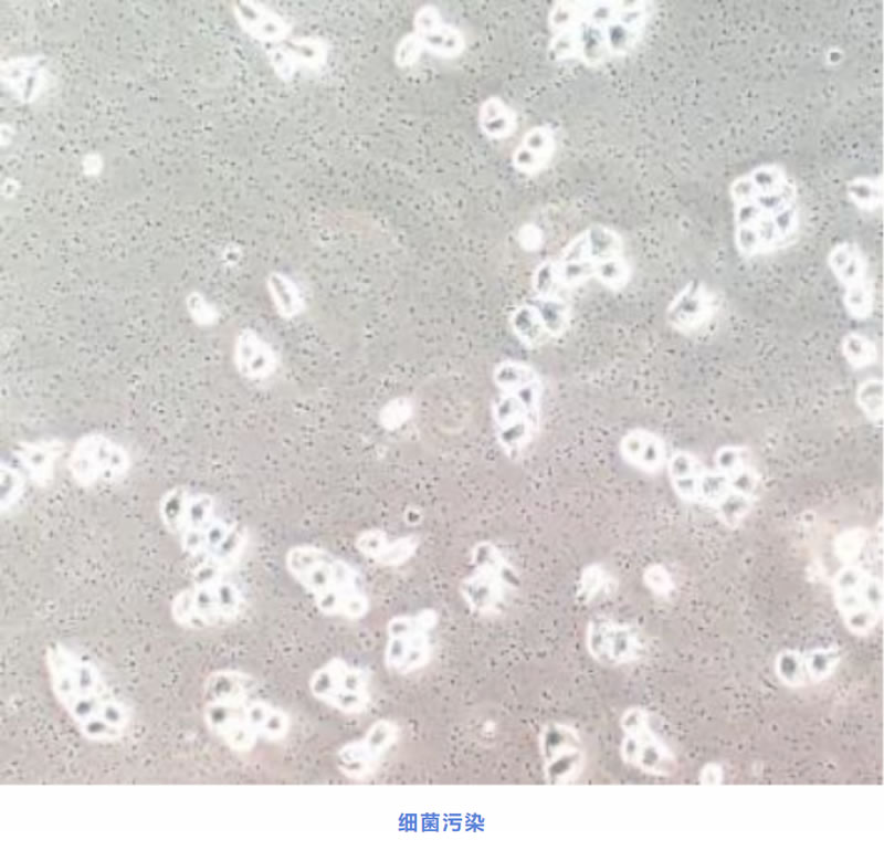 主要有白色葡萄球菌,大腸桿菌,假單孢菌、枯草桿菌等;細(xì)胞被污染后培養(yǎng)基會(huì)很快變黃變渾濁,在顯微鏡下可觀察到細(xì)胞間有細(xì)小菌體移動(dòng),在數(shù)小時(shí)內(nèi)會(huì)出現(xiàn)細(xì)胞脫落漂浮,培養(yǎng)液中呈細(xì)沙狀。這種污染通常是操作不規(guī)范或無菌措施不到位等引起的。